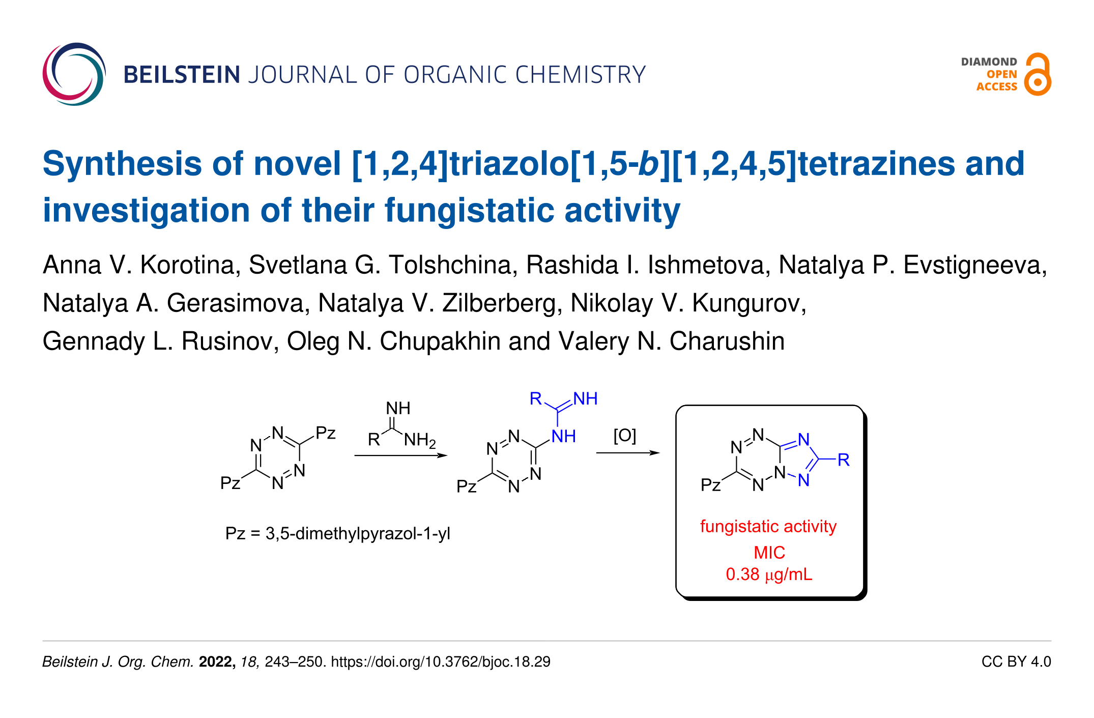 Korotina, A. V.; Tolshchina, S. G.; Ishmetova, R. I.; Evstigneeva, N. P.; Gerasimova, N. A.; Zilberberg, N. V.; Kungurov, N. V.; Rusinov, G. L.; Chupakhin, O. N.; Charushin, V. N. Beilstein J. Org. Chem. 2022, 18, 243–250. doi:10.3762/bjoc.18.29