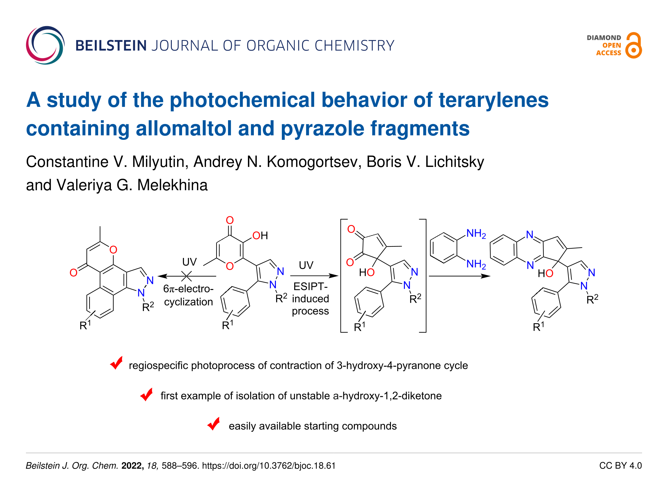 - Komogortsev, A. N.; Milyutin, C. V.; Lichitsky, B. V.; Migulin, V. A. UV-assisted rearrangement of substituted 3-arylaminopyrazoles with an allomaltol fragment into tricyclic cyclopenta[4,5]pyrrolo[2,3-c]pyrazole derivatives. Organic & biomolecular chemistry 2025, 23, 6738–6744. doi:10.1039/d5ob00796h