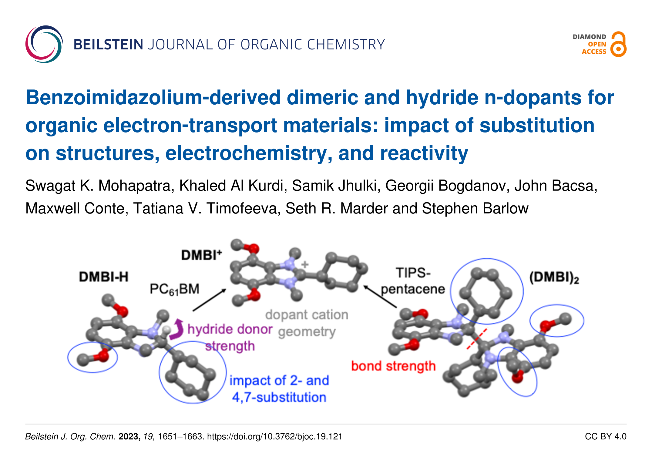- Tang, K.; Brown, M. R.; Risko, C.; Gish, M. K.; Rumbles, G.; Pham, P. H.; Luca, O. R.; Barlow, S.; Marder, S. R. Beyond n-dopants for organic semiconductors: use of bibenzo[d]imidazoles in UV-promoted dehalogenation reactions of organic halides. Beilstein journal of organic chemistry 2023, 19, 1912–1922. doi:10.3762/bjoc.19.142