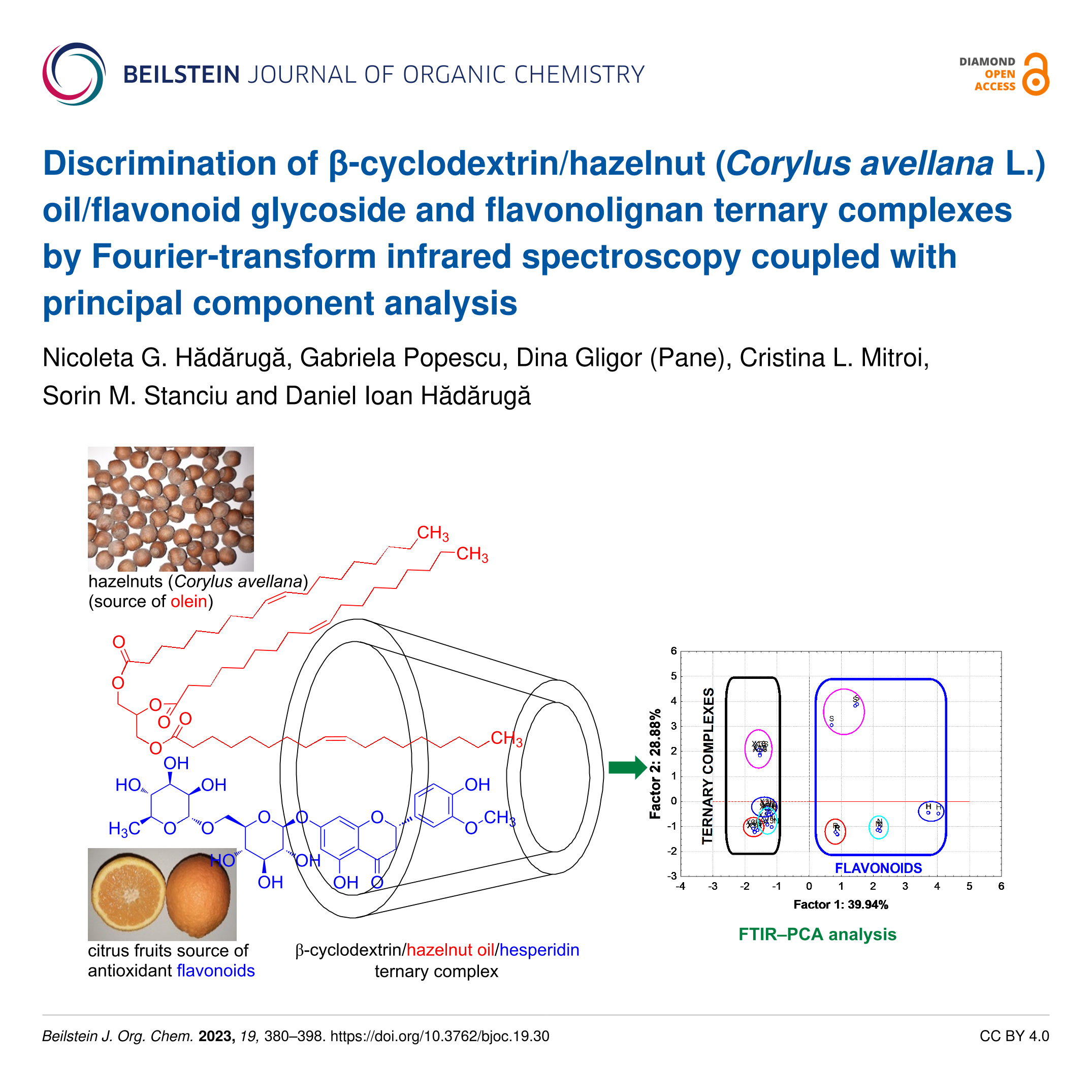 Discrimination of β-cyclodextrin/hazelnut (Corylus avellana L.) oil/flavonoid glycoside and flavonolignan ternary complexes by Fourier-transform infrared spectroscopy coupled with principal component analysis