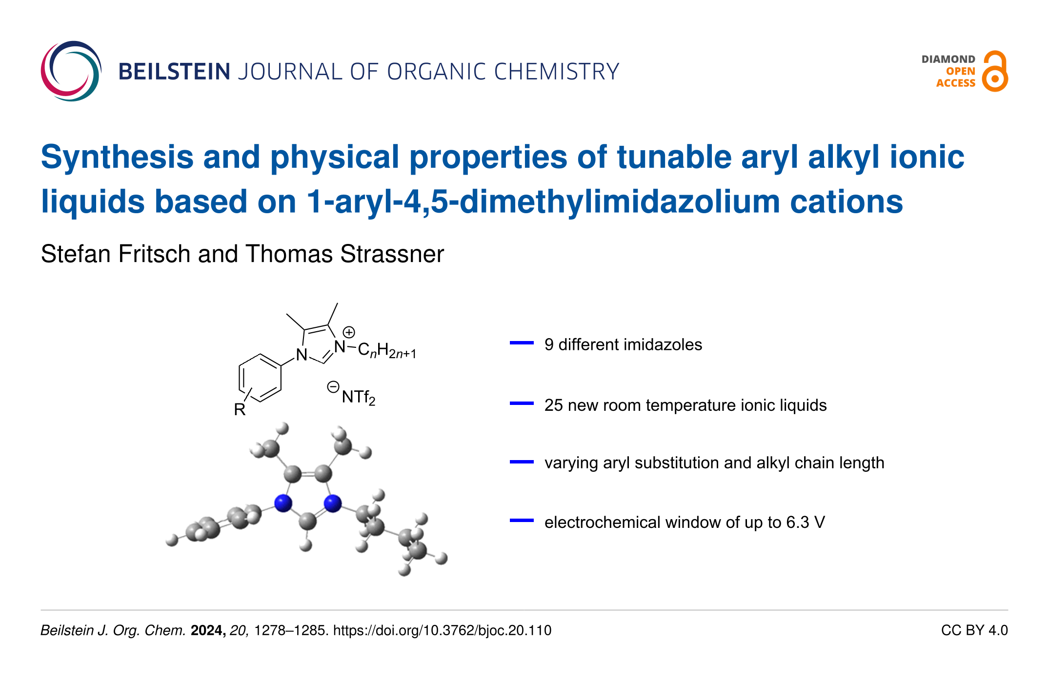 - Fritsch, S.; Strassner, T. Synthesis of Alkylated 1‐Aryl‐4,5‐Dimethylimidazolium‐Based Tunable Aryl Alkyl Ionic Liquids (TAAILs). European Journal of Organic Chemistry 2025, 28. doi:10.1002/ejoc.202500164