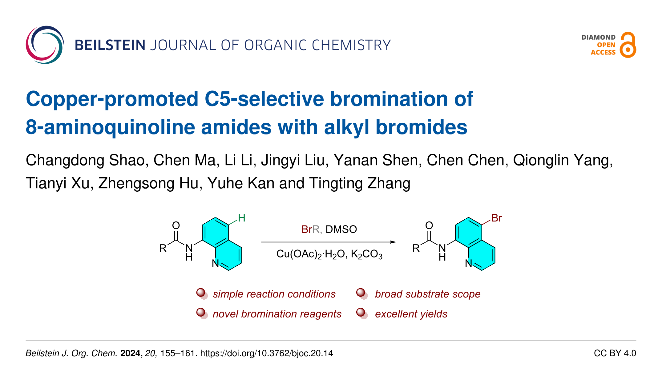 - Shao, C.; Liu, J.; Shen, Y.; Li, L.; Ma, C.; Hu, Z.; Kan, Y.; Chen, P.; Zhang, T. Copper-promoted oxidative mono- and di-bromination of 8-aminoquinoline amides with HBr and DMSO. RSC advances 2025, 15, 8750–8756. doi:10.1039/d5ra00492f