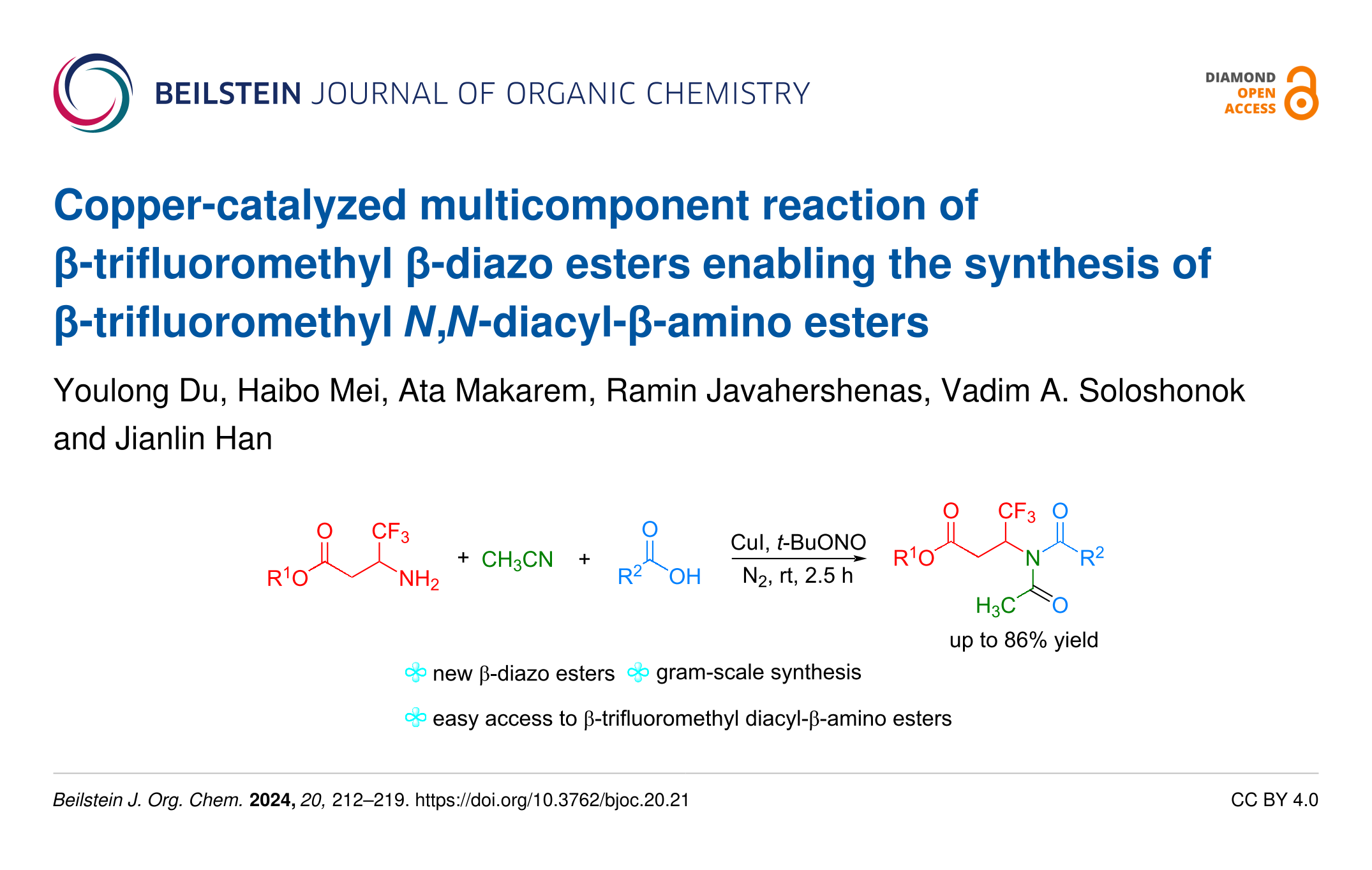 - Mei, H.; Du, Y.; Wang, Q.; Escorihuela, J.; Kiss, L.; Soloshonok, V. A.; Han, J. Cu‐Catalyzed Reaction of Trifluoromethylated β‐Keto Diazos and Nitriles Proceeding via H2O Addition to Nitrile Ylides. Advanced Synthesis & Catalysis 2024, 366, 3443–3449. doi:10.1002/adsc.202400402
