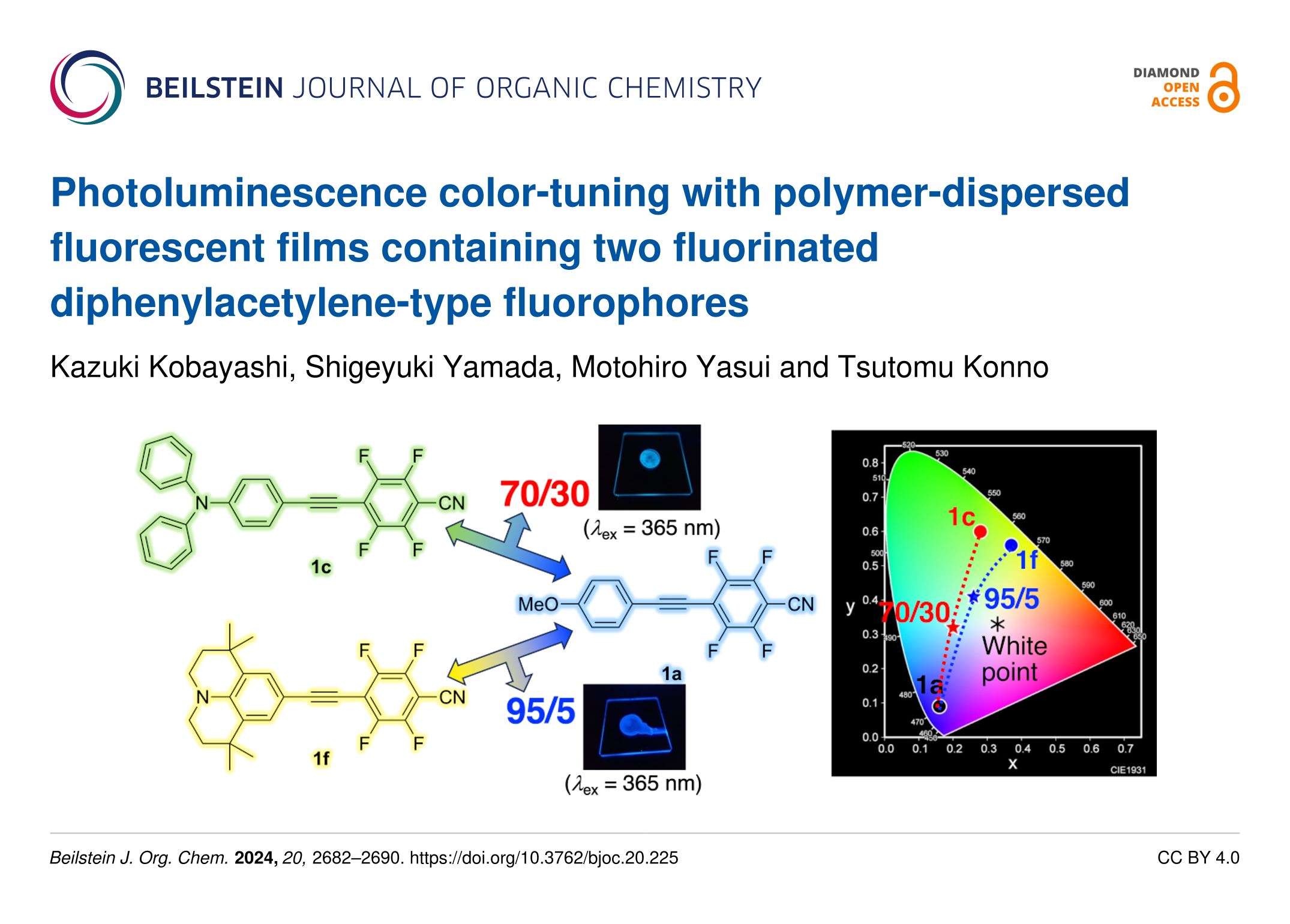 - YAMADA, S.; YASUI, M.; KONNO, T. Development of D-π-A-type Fluorinated Tolanes Showing Blue, Yellow, and Red Fluorescence in Solid-State by Precise Molecular Design and Their Application to White Fluorescent Materials. Journal of the Japan Society of Colour Material 2025, 98, 68–74. doi:10.4011/shikizai.98.68