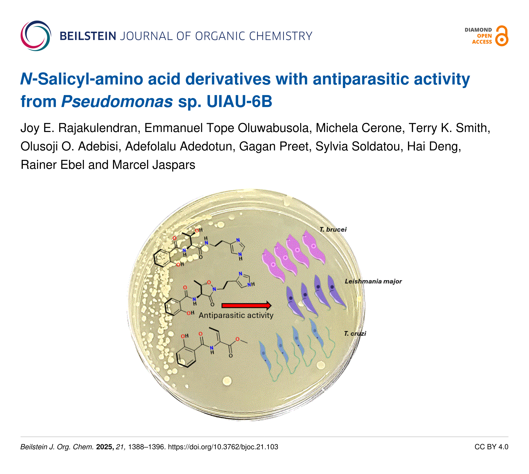 Rajakulendran, J. E.; Oluwabusola, E. T.; Cerone, M.; Smith, T. K.; Adebisi, O. O.; Adedotun, A.; Preet, G.; Soldatou, S.; Deng, H.; Ebel, R.; Jaspars, M. Beilstein J. Org. Chem. 2025, 21, 1388–1396. doi:10.3762/bjoc.21.103