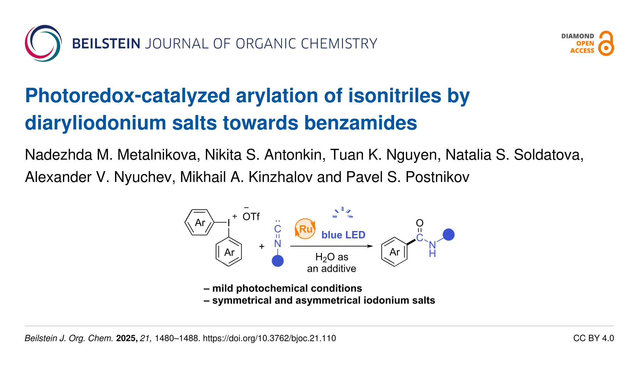Metalnikova, N. M.; Antonkin, N. S.; Nguyen, T. K.; Soldatova, N. S.; Nyuchev, A. V.; Kinzhalov, M. A.; Postnikov, P. S. Beilstein J. Org. Chem. 2025, 21, 1480–1488. doi:10.3762/bjoc.21.110