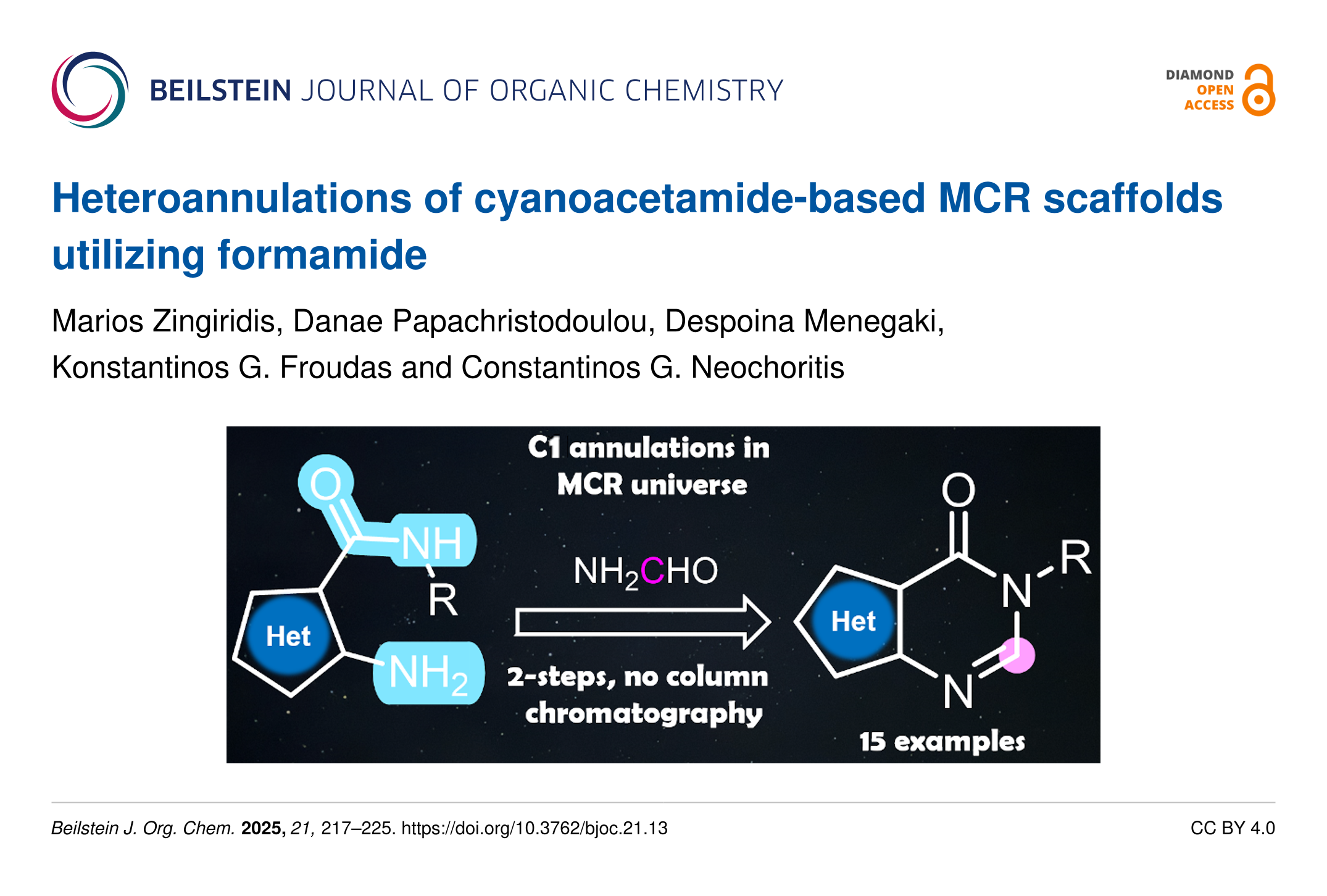 Zingiridis, M.; Papachristodoulou, D.; Menegaki, D.; Froudas, K. G.; Neochoritis, C. G. Beilstein J. Org. Chem. 2025, 21, 217–225. doi:10.3762/bjoc.21.13