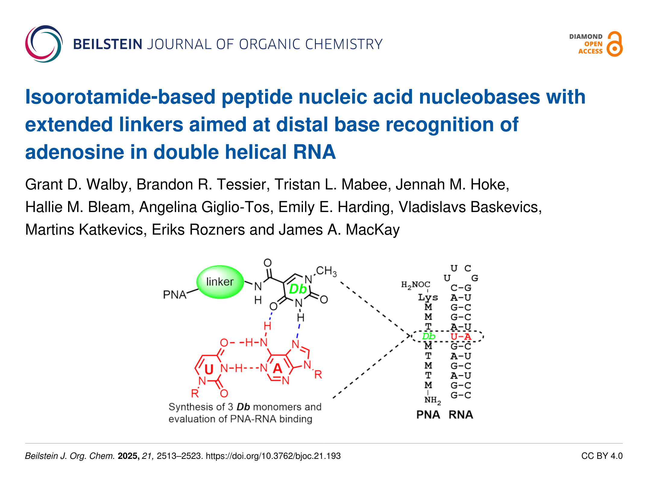 Walby, G. D.; Tessier, B. R.; Mabee, T. L.; Hoke, J. M.; Bleam, H. M.; Giglio-Tos, A.; Harding, E. E.; Baskevics, V.; Katkevics, M.; Rozners, E.; MacKay, J. A. Beilstein J. Org. Chem. 2025, 21, 2513–2523. doi:10.3762/bjoc.21.193