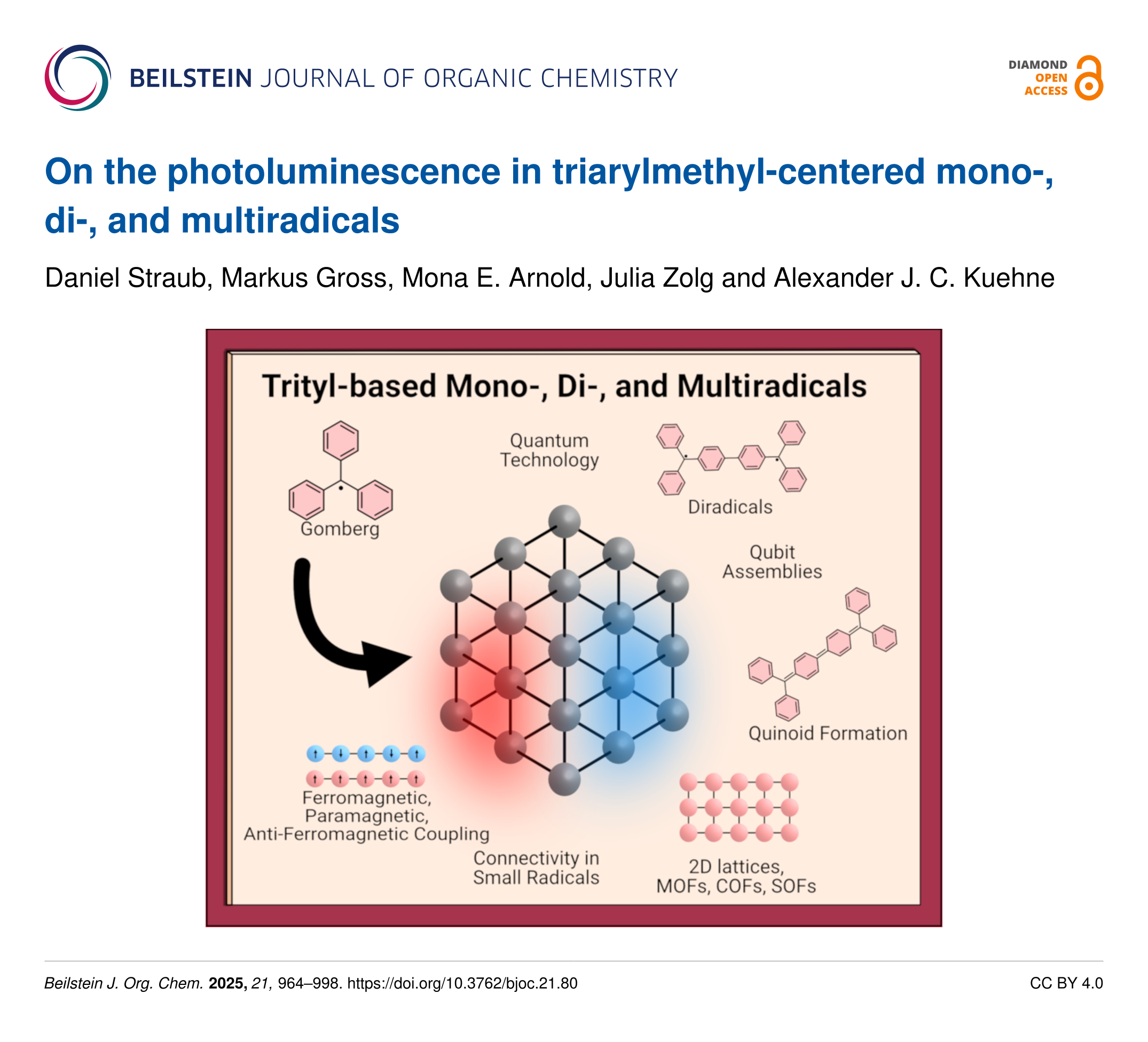 - Schöneburg, L.; Arnold, M. E.; Rapp, M. R.; Blinder, R.; Gross, M.; Zolg, J.; Jelezko, F.; Bettinger, H. F.; Kuehne, A. J. C. A novel [2.2]paracyclophane bridged tris(2,4,6-trichlorophenyl)methyl-diradical and its interaction with circularly polarized light. Journal of Materials Chemistry C 2026. doi:10.1039/d5tc02343b