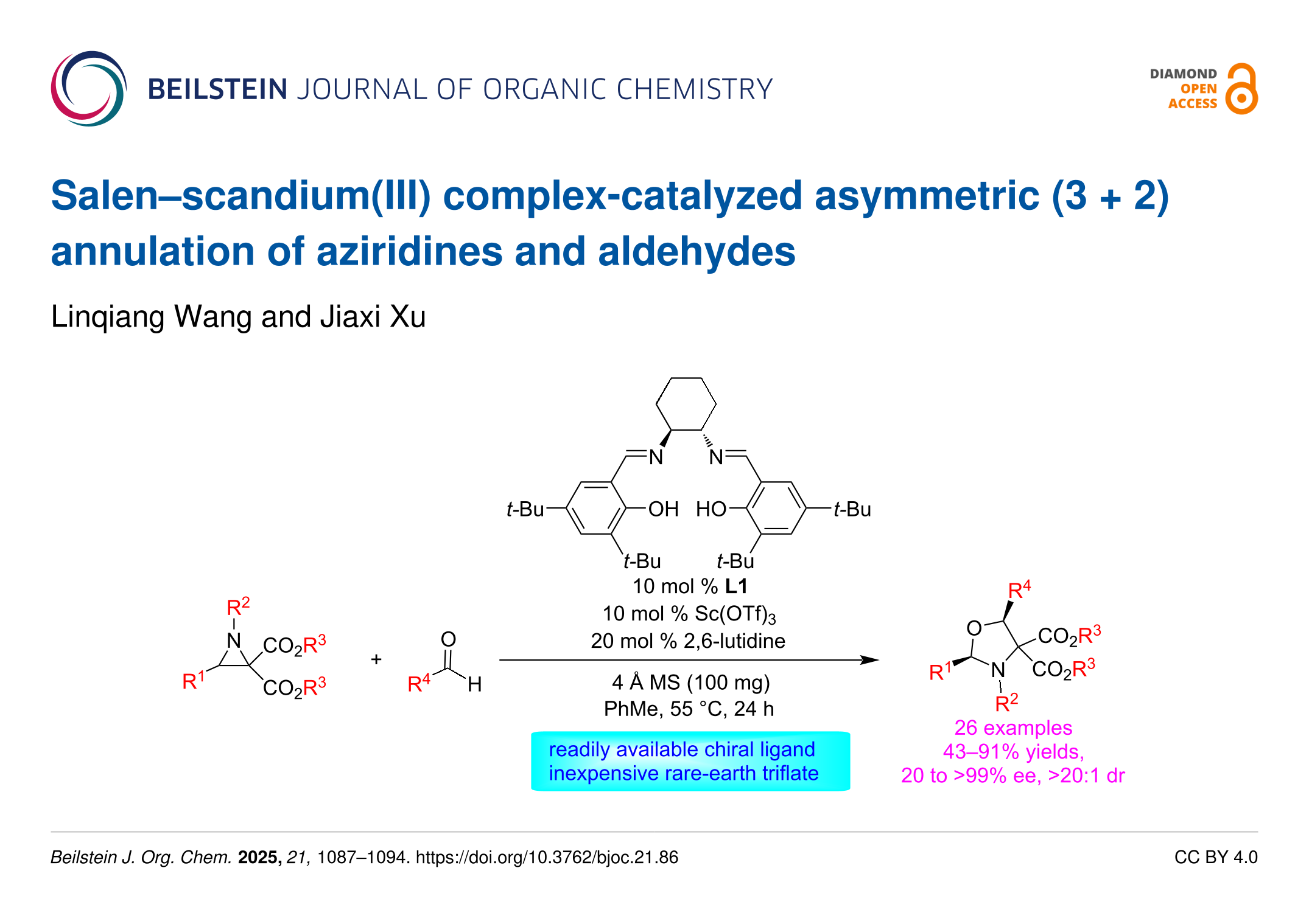 Salen–scandium(III) complex-catalyzed asymmetric (3 + 2) annulation of aziridines and aldehydes